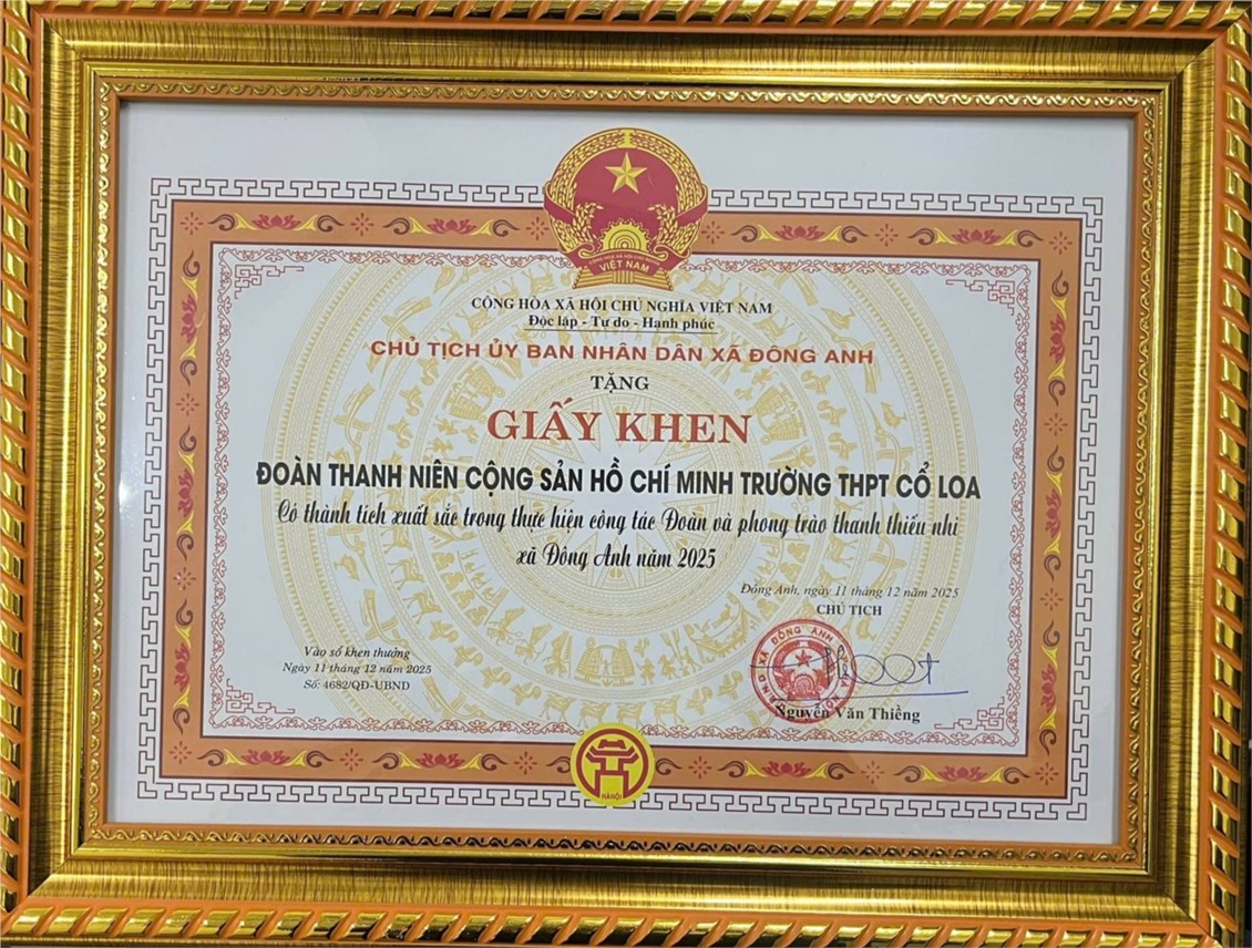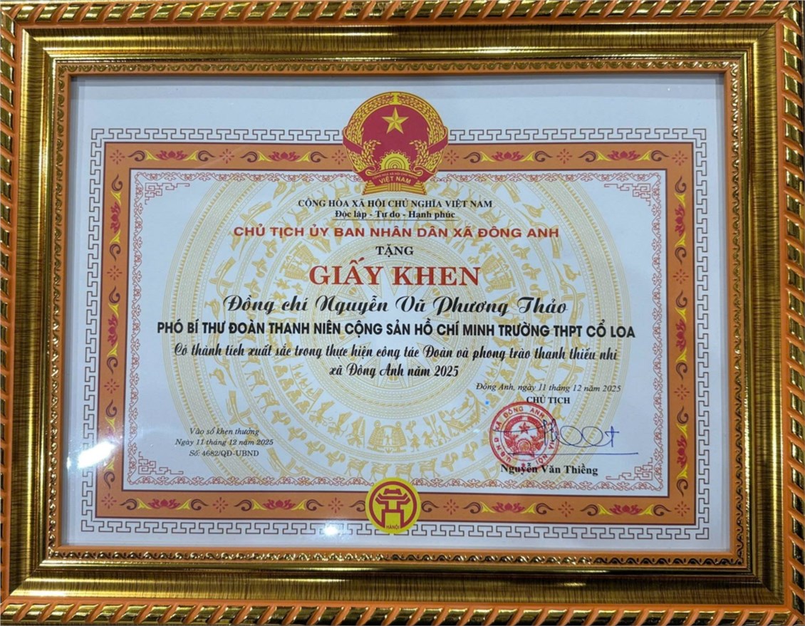 Giấy khen của Chủ tịch UBND xã Đông Anh: Đã có thành tích xuất sắc trong công tác Đoàn và phong trào TTN xã Đông Anh năm 2025.