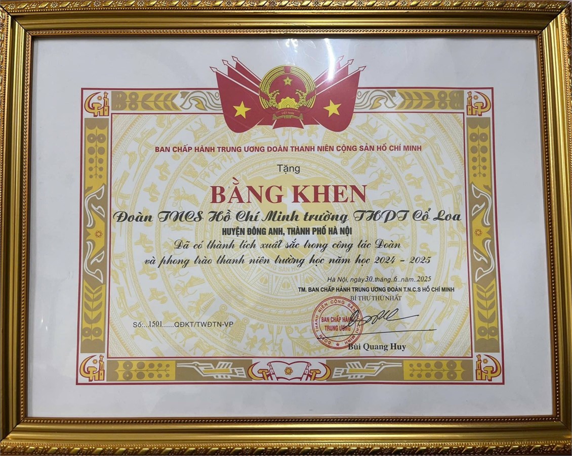 Bằng khen của TW Đoàn TNCS Hồ Chí Minh: Đã có thành tích xuất sắc trong công tác Đoàn và phong trào thanh niên trường học năm học 2024 - 2025.